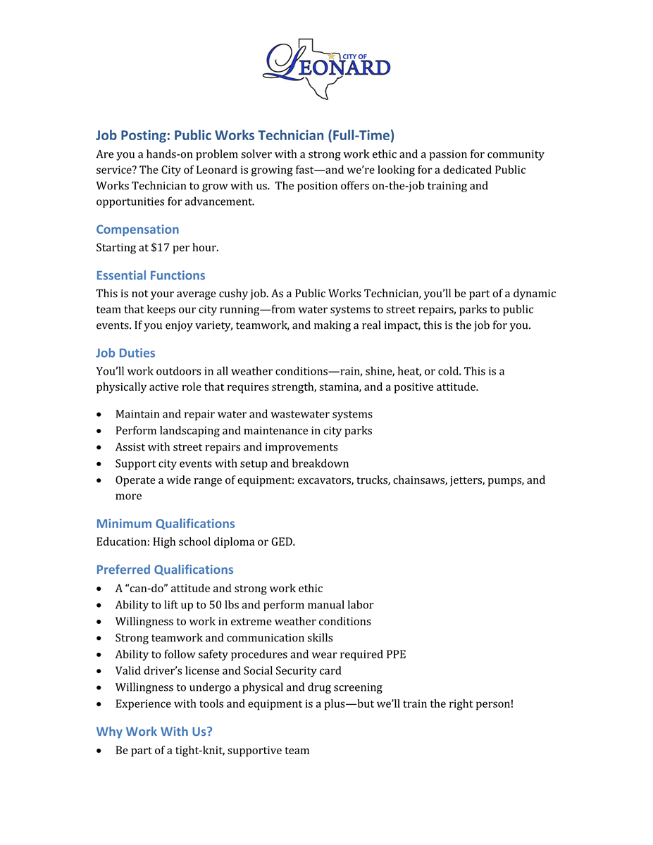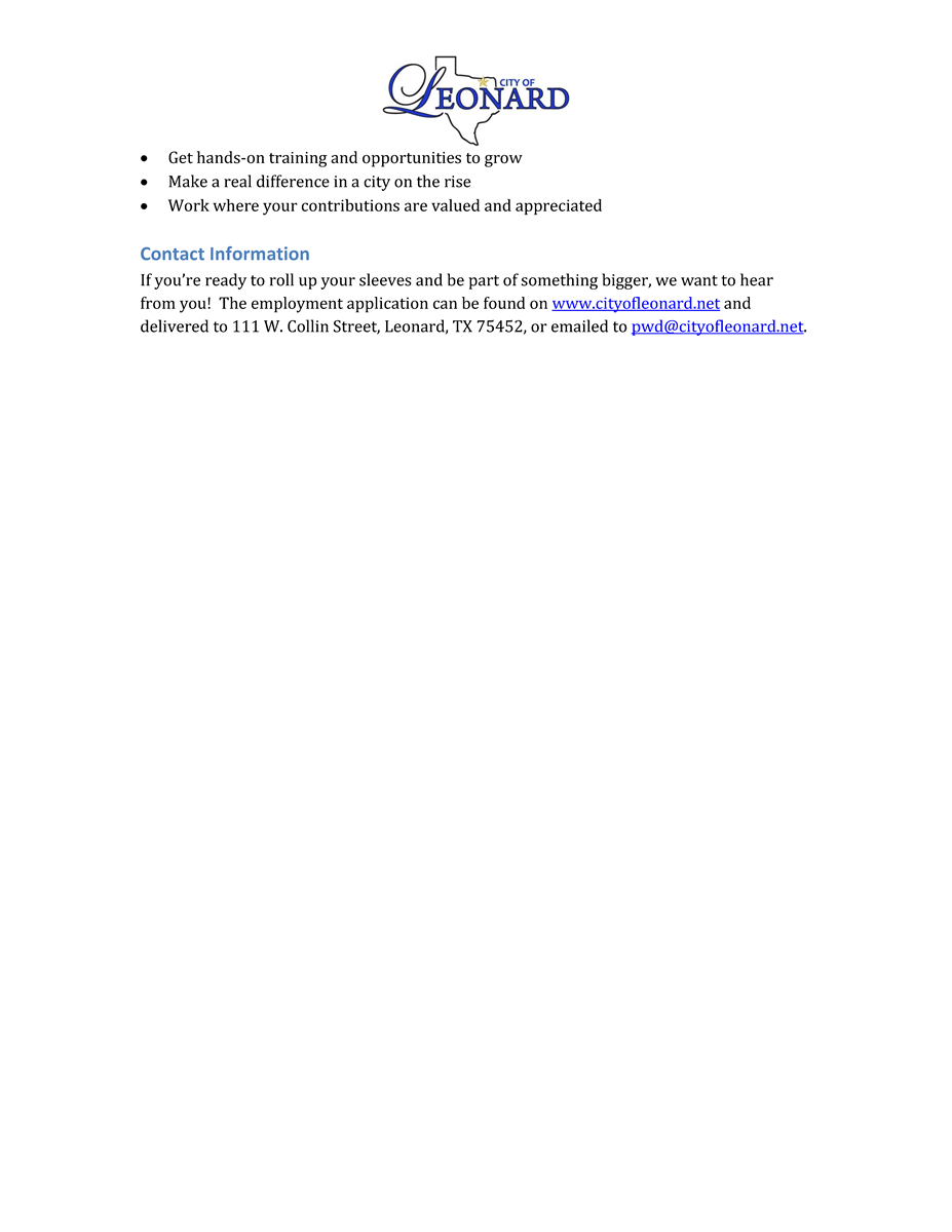Email Resumes/Applications to: pwd@cityofleonard.net